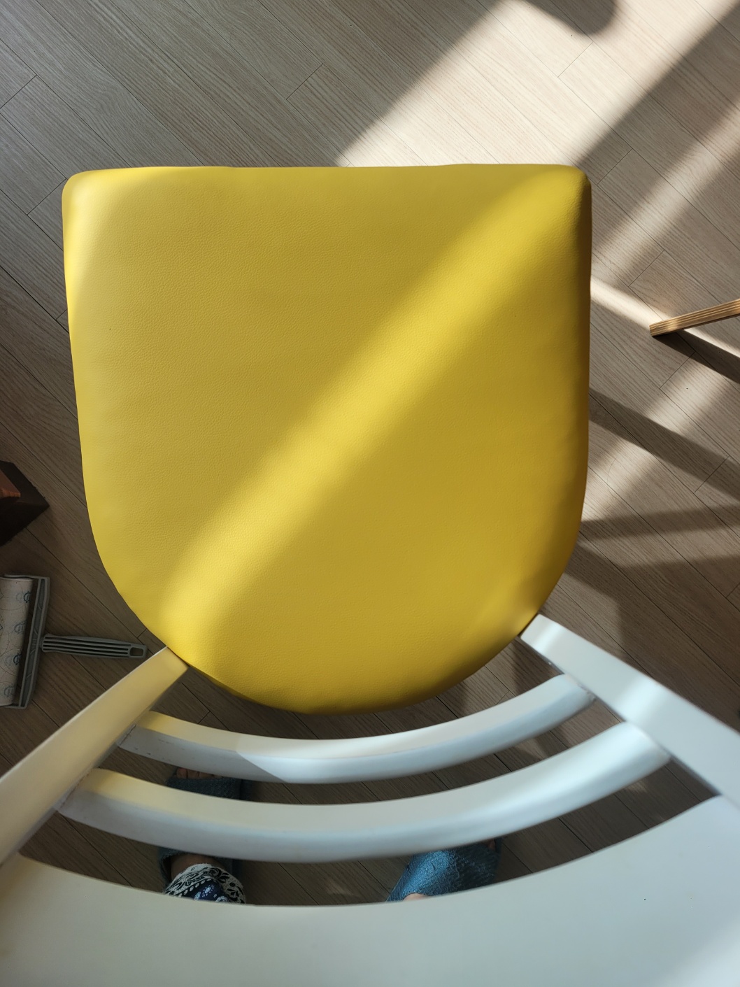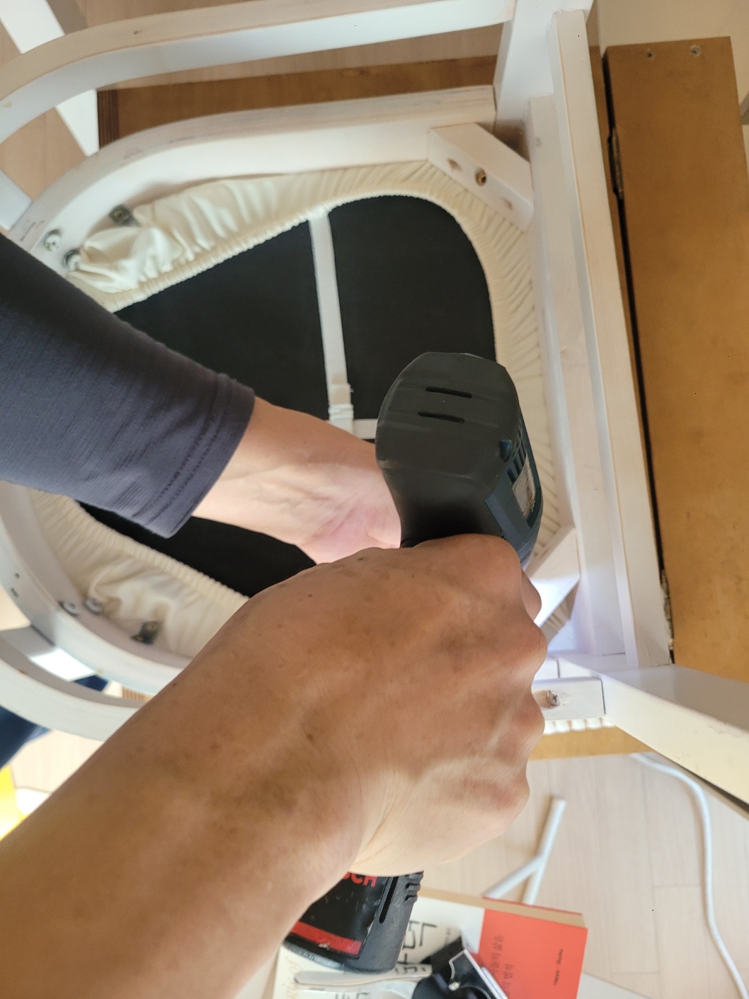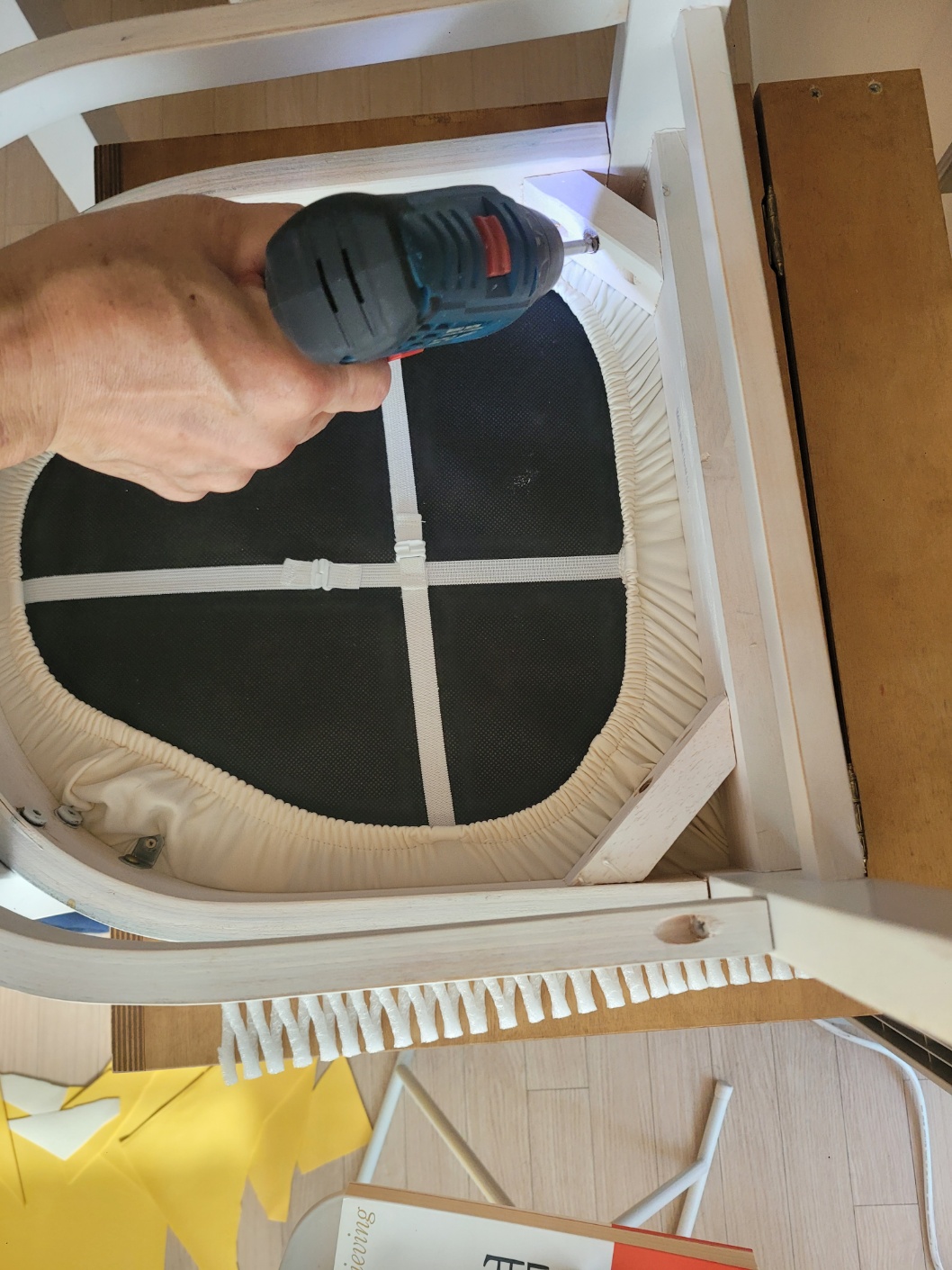 다음 의자도 등받이와 방석 부분을 분리해서 시도해줍니다. 전에 뒤집어 씌웠던 의자 가죽커버가 보이네요.