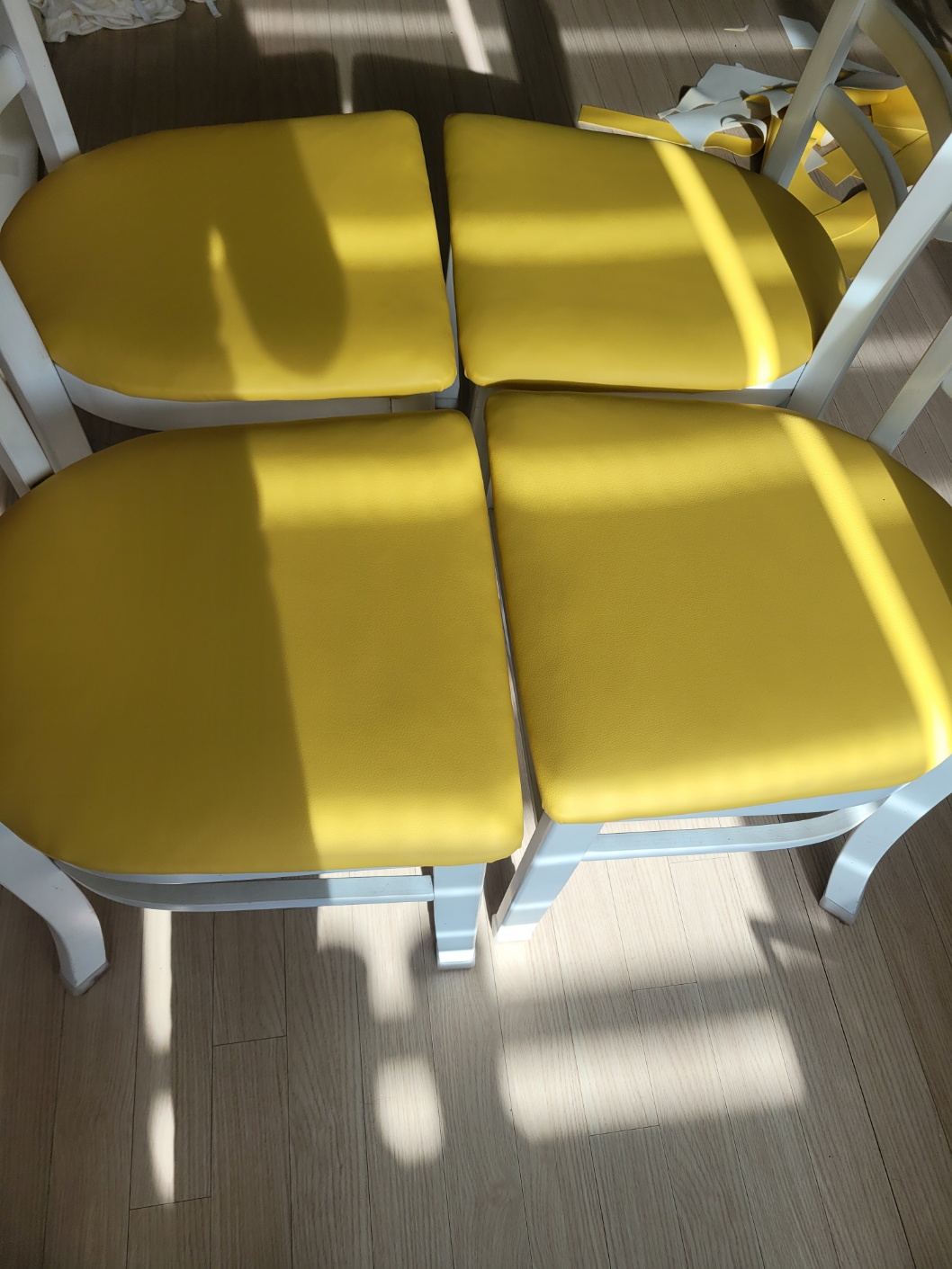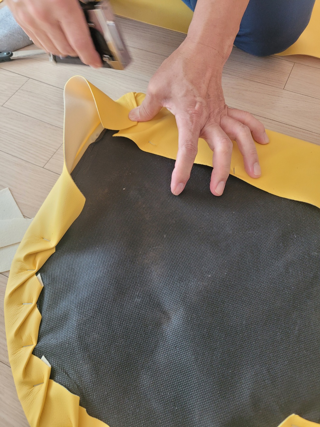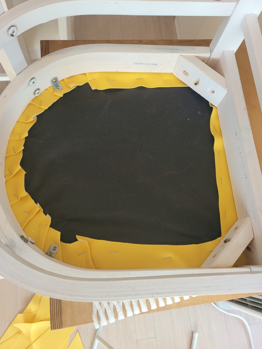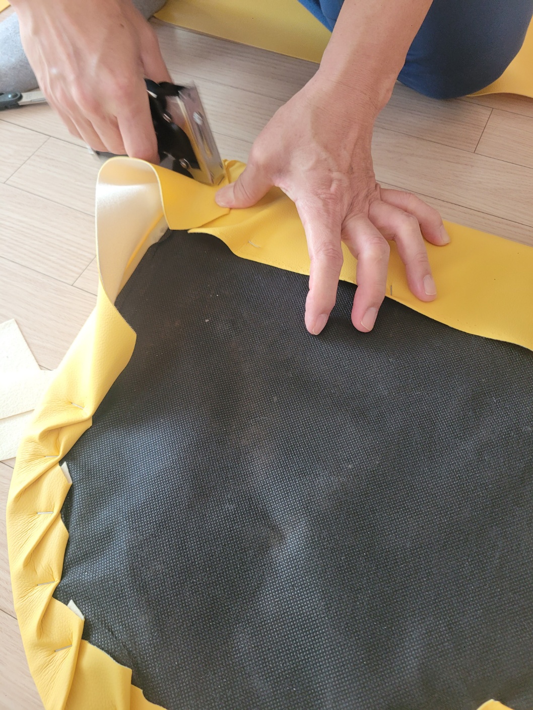 나머지도 처음과 같이 가죽 원단을 당겨주면서 타카로 박아줍니다.  노란 가죽옷으로 갈아입은 식탁의자 어떤가요?