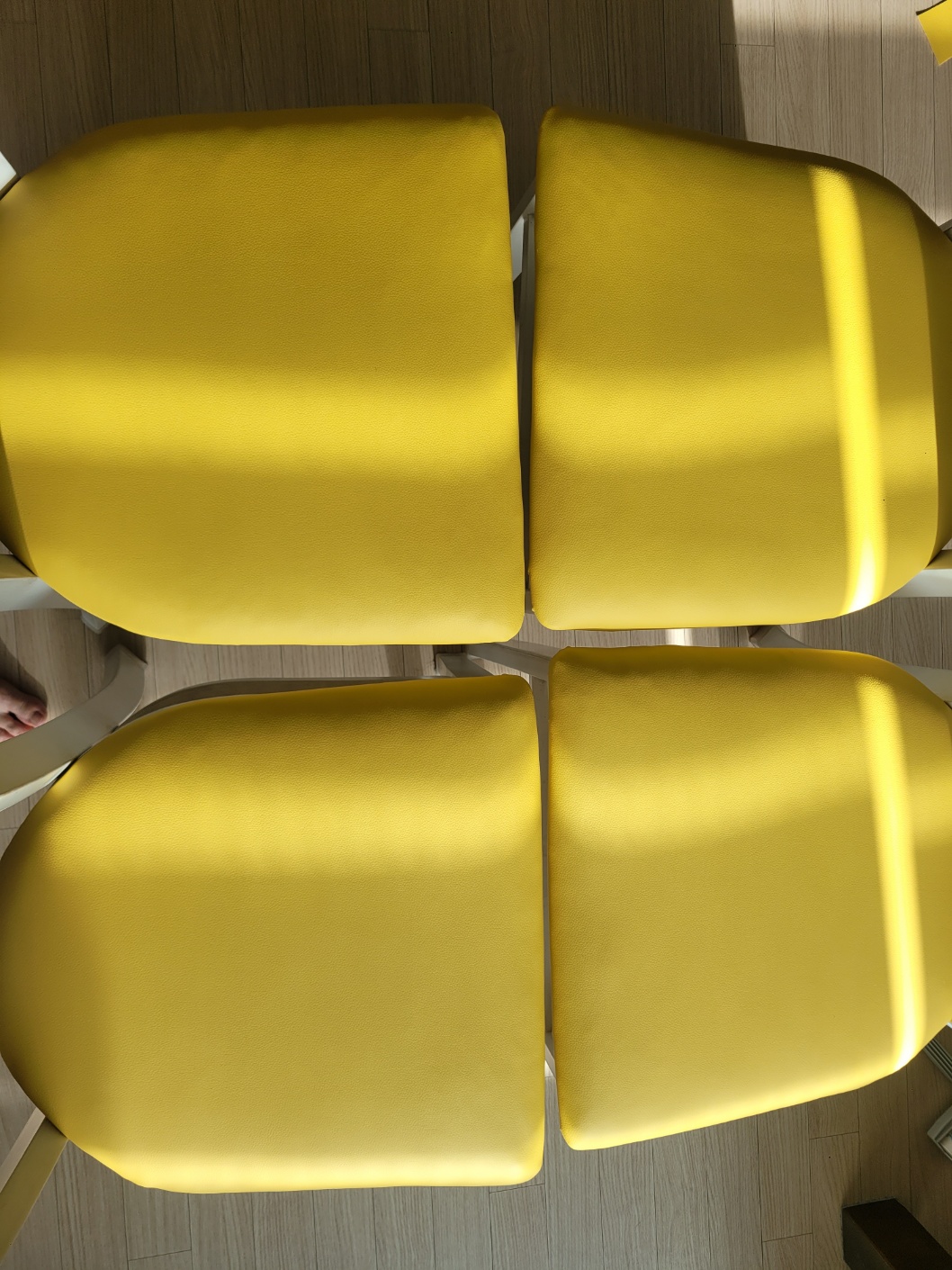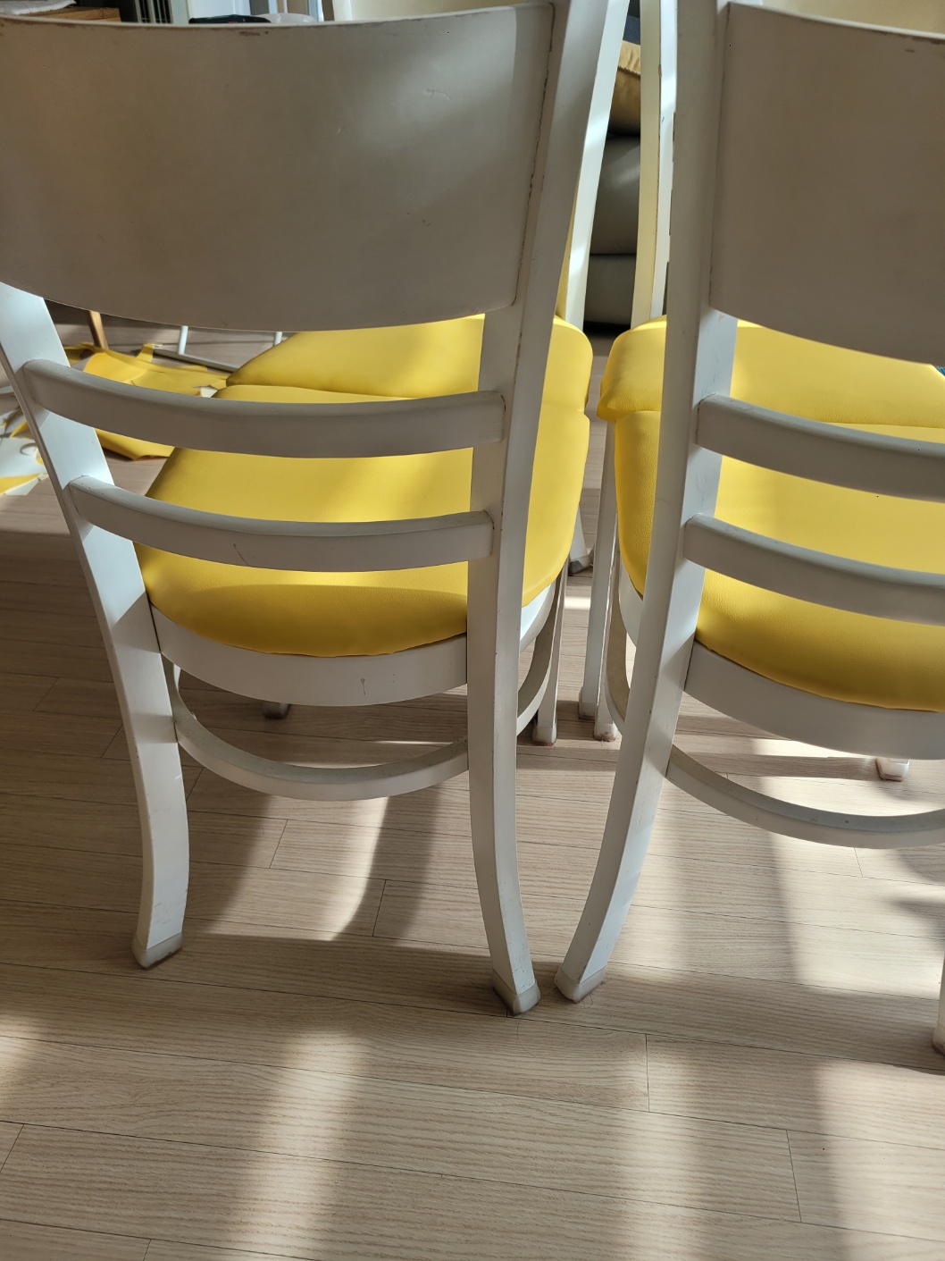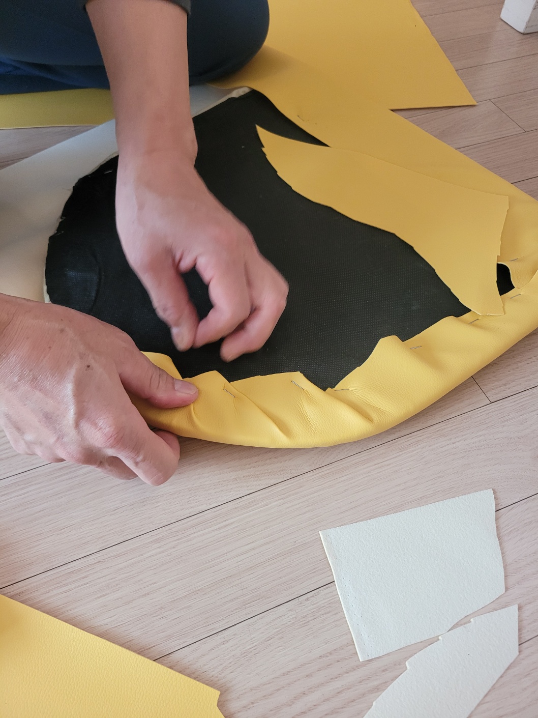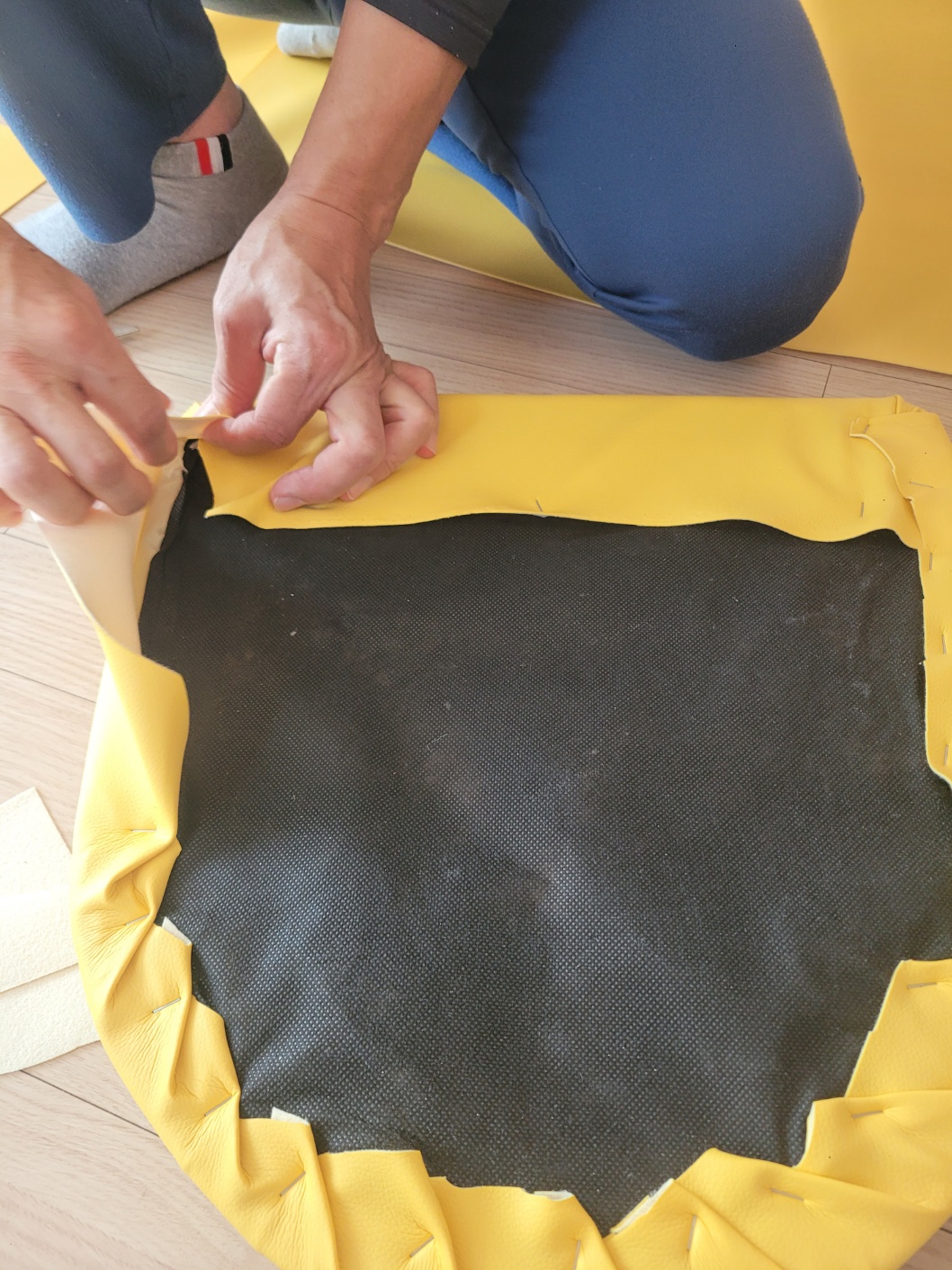 나머지도 처음과 같이 가죽 원단을 당겨주면서 타카로 박아줍니다.  노란 가죽옷으로 갈아입은 식탁의자 어떤가요?