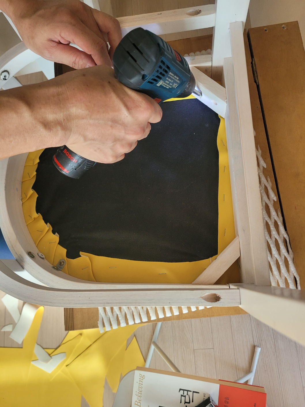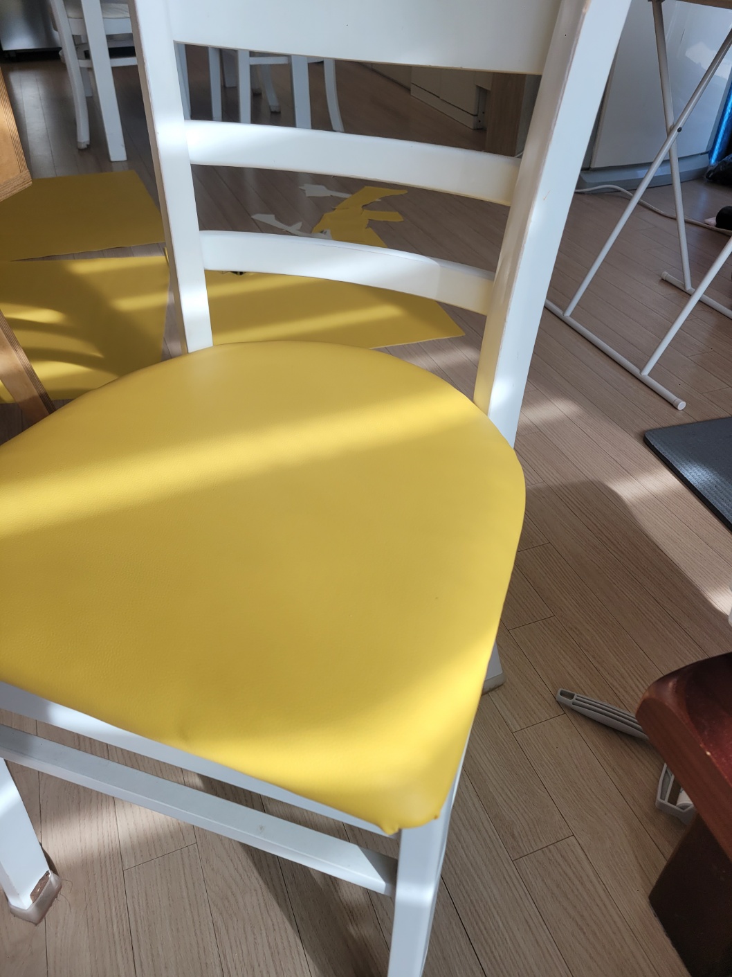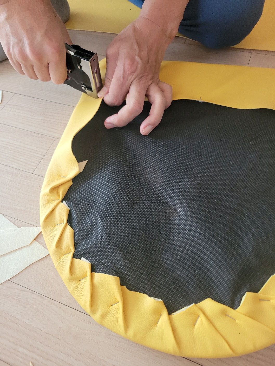 나머지도 처음과 같이 가죽 원단을 당겨주면서 타카로 박아줍니다. 노란 가죽옷으로 갈아입은 식탁의자 어떤가요?